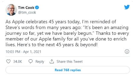 去年 4 月 1 日,CEO 蒂姆?庫克在紀念蘋(píng)果公司成立 45 周年時(shí)發(fā)了一條推特,回顧了他的朋友和同事、聯(lián)合創(chuàng )始人史蒂夫?喬布斯。