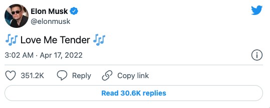 上周,馬斯克提出以每股 54.20 美元、總價(jià)值 430 億美元收購 Twitter,引發(fā)轟動(dòng),導致 Twitter 在上周五采用了一項所謂的“毒丸防御計劃”,讓馬斯克或一群投資者更難獲得更多股票。如果 Twitter 的董事們最終拒絕了他,全世界就會(huì )知道馬斯克這條推文是否是在真的威脅要直接吸引股東,還是剛剛把 1956 年“貓王”埃爾維斯?普雷斯利 (Elvis Presley) 的熱門(mén)歌曲《溫柔地愛(ài)我》(Love Me Tender) 加入了他的播放列表。
