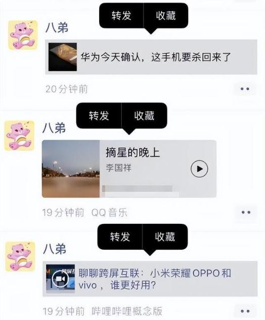 比如,八弟發(fā)的朋友圈,機哥按了轉發(fā),就能夠發(fā)送給八弟、或者發(fā)送給其他微信好友。