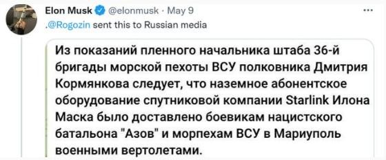隨后,他又在推特上分享了據稱(chēng)是羅戈津寫(xiě)給俄媒的一封信,信中提到因為他旗下的 SpaceX 向烏克蘭馬里烏波爾的“納粹”武裝分子提供互聯(lián)網(wǎng)終端,他將為此被追究“責任”。