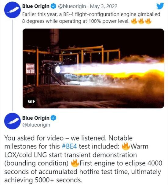 貝索斯的藍色起源成功測試了 100% 推力的 BE-4 火箭發(fā)動(dòng)機,能夠達到 550000lbf 的推力。