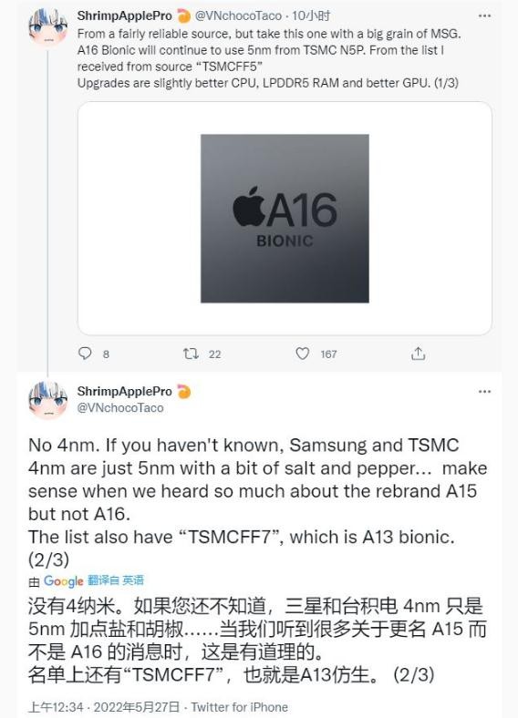 現有一位可靠度較高的爆料者(@ShrimpApplePro)表示他有“相當可靠的消息來(lái)源”稱(chēng)蘋(píng)果 A16 Bionic 將采用臺積電 5nm(N5P)工藝進(jìn)行生產(chǎn),而不是此前業(yè)界預估的 4nm,但新的一代 A16 將帶來(lái)更好的 CPU、GPU 和 LPDDR5 RAM。