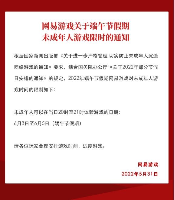 網(wǎng)易游戲表示,根據國家新聞出版署《關(guān)于進(jìn)一步嚴格管理切實(shí)防止未成年人沉迷網(wǎng)絡(luò )游戲的通知》要求,結合國務(wù)院辦公廳《關(guān)于 2022 年部分節假日安排的通知》的規定,2022 年端午節假期網(wǎng)易游戲對未成年人游戲時(shí)間的限制如下:
