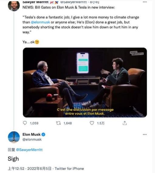 馬斯克隨后在報道蓋茨此次采訪(fǎng)的推文下以一聲嘆息回復:“哎!”