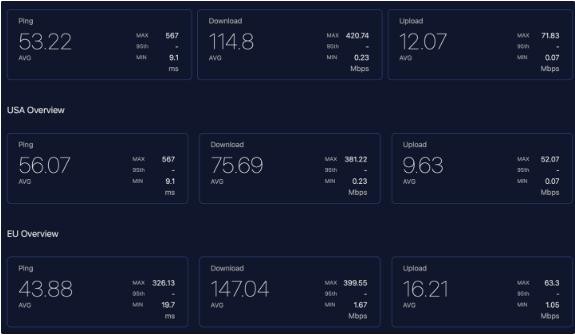 歐盟和其他國家的平均速度也有所下降。2021 年 7 月的數據顯示,平均下載速度為 176 Mbps 和 157 Mbps,上傳速度為 34 Mbps 和 27 Mbps,ping 為 34 毫秒和 44 毫秒?,F在的下載速度大約為 147 Mbps 和 115 Mbps,上傳速度為 16 Mbps 和 12 MBps,ping 為 16 毫秒和 12 毫秒。然而,與美國用戶(hù)的情況一樣,峰值和最小延遲都有明顯改善。