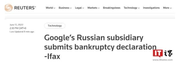 據路透社報道,今日,俄羅斯國際文傳電訊社援引法庭在線(xiàn)文件稱(chēng),Alphabet 旗下谷歌的俄羅斯子公司已提交破產(chǎn)聲明。