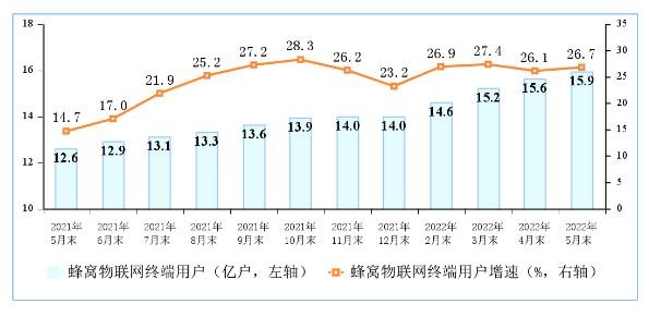根據工信部發(fā)布的《2022 年 1-5 月份通信業(yè)經(jīng)濟運行情況》,截止 5 月底,我國蜂窩物聯(lián)網(wǎng)用戶(hù)已達 15.9 億戶(hù),相比去年底凈增 1.96 億戶(hù)。而移動(dòng)電話(huà)用戶(hù)總數為 16.6 億戶(hù),相比去年底凈增 1966 萬(wàn)戶(hù)。