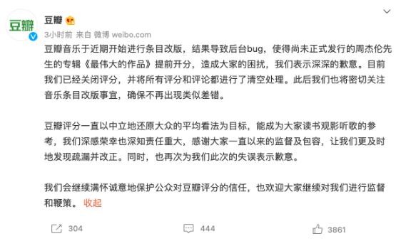 豆瓣官方致歉,稱(chēng)豆瓣音樂(lè )于近期開(kāi)始進(jìn)行條目改版,結果導致后臺 bug,使得尚未正式發(fā)行的周杰倫先生的專(zhuān)輯《最偉大的作品》提前開(kāi)分。