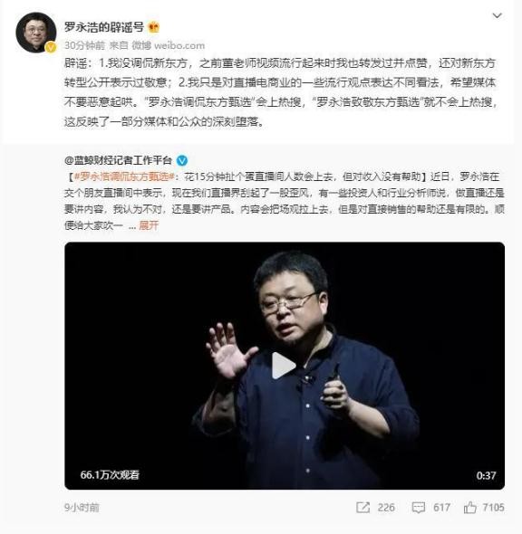 #羅永浩調侃東方甄選#上熱搜,對此@羅永浩的辟謠號發(fā)文否認調侃新東方。羅永浩在文中表示,“1.我沒(méi)調侃新東方,之前董老師視頻流行起來(lái)時(shí)我也轉發(fā)過(guò)并點(diǎn)贊,還對新東方轉型公開(kāi)表示過(guò)敬意;2.我只是對直播電商業(yè)的一些流行觀(guān)點(diǎn)表達不同看法,希望媒體不要惡意起哄。”羅永浩調侃東方甄選“會(huì )上熱搜,“羅永浩致敬東方甄選”就不會(huì )上熱搜,這反映了一部分媒體和公眾的深刻墮落。”