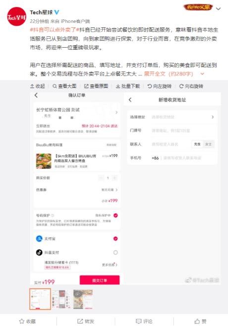 抖音已嘗試推出餐飲即時(shí)配送服務(wù) 目前這一功能叫做“團購配送” 10:18:41