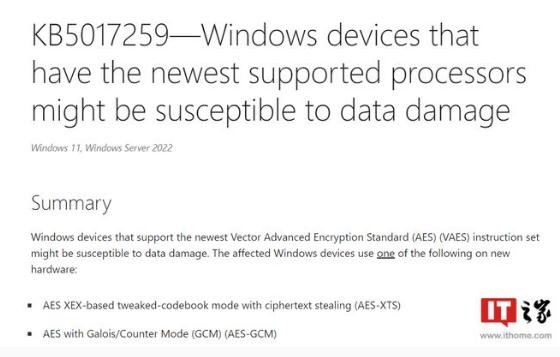 微軟稱(chēng),受影響的系統搭載了支持最新 Vector Advanced Encryption Standard (VAES) 指令集的處理器,具體來(lái)說(shuō),包括英特爾 10 代酷睿(Ice Lake)和第三代至強可擴展處理器(IceLake-SP),以及 AMDZen 4 架構處理器。