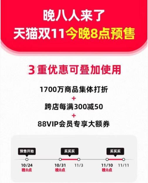 據介紹,今年雙 11,消費者可以將三重優(yōu)惠疊加使用:1700 萬(wàn)商品集體打折、全場(chǎng)跨店每滿(mǎn) 300 減 50、88VIP 會(huì )員再領(lǐng) 820 元大額券。