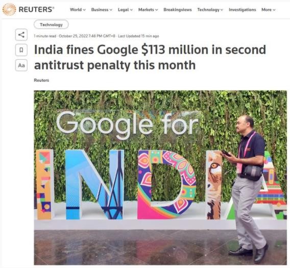 谷歌再次被印度罰款93.6億盧比 因印度本月完成另一項反壟斷調查 10:02:16