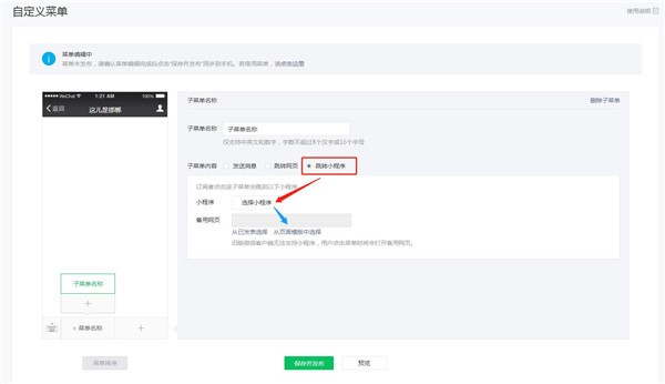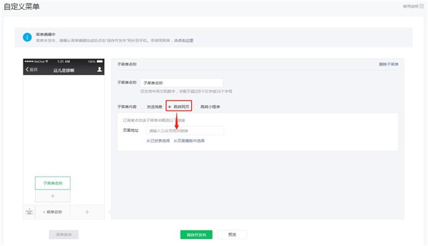 7.如果需要點(diǎn)擊跳轉到小程序,那就選擇第三個(gè)跳轉小程序,然后在下面選擇上關(guān)聯(lián)著(zhù)公眾號的小程序,這里需要注意,小程序要和公眾號關(guān)聯(lián)才可以。(在左側標簽小程序管理內進(jìn)行關(guān)聯(lián))