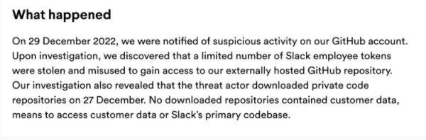 2022 年 12 月 29 日,我們被告知我們的 GitHub 賬戶(hù)上有可疑活動(dòng)。經(jīng)調查,我們發(fā)現數量有限的 Slack 員工令牌被盜,并被濫用于訪(fǎng)問(wèn)我們外部托管的 GitHub 倉庫。我們的調查還顯示,黑客在 12 月 27 日下載了私有代碼庫。下載的倉庫沒(méi)有包含客戶(hù)數據、訪(fǎng)問(wèn)客戶(hù)數據的手段或 Slack 的主要代碼庫。