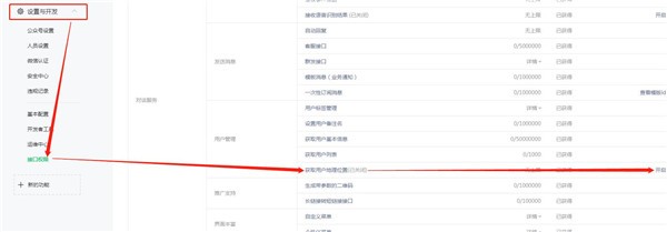 2.進(jìn)入到公眾號后臺,找到左側菜單設置與開(kāi)發(fā)里的接口權限,然后右邊就可以看到用戶(hù)管理中的獲取用戶(hù)地理位置是已關(guān)閉的狀態(tài),點(diǎn)擊后方開(kāi)啟。