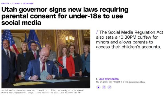 猶他州州長(cháng) Spencer Cox 于本周四簽署了兩項法律 ——H.B. 311 和 S.B. 152,構成了新的猶他州社交媒體監管法案的一部分,該法案旨在保護兒童免受社交平臺令人上癮的功能和有針對性的廣告侵害。
