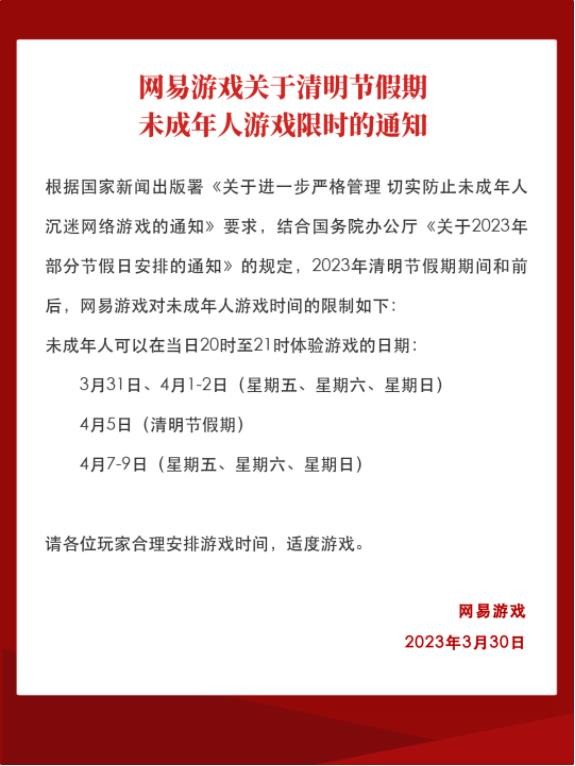網(wǎng)易游戲官方發(fā)布《關(guān)于清明節假期未成年人游戲限時(shí)的通知》。在清明節假期當天,未成年人玩家只有晚上 20:00 至 21:00 一小時(shí)玩游戲的時(shí)間。