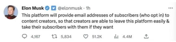 馬斯克今日發(fā)布推文,稱(chēng)推特將向內容創(chuàng )作者提供訂閱者的電子郵件地址。馬斯克稱(chēng),此舉是為了讓創(chuàng )作者能夠輕松離開(kāi)該平臺并在需要時(shí)帶走他們的訂閱者。