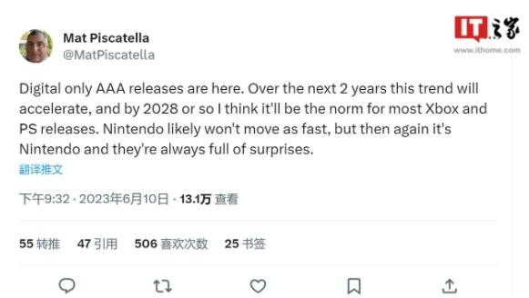 Mat Piscatela 表示在接下來(lái)兩年內,3A 大作“僅發(fā)布數字版本”這一情況將會(huì )普遍,他認為到了 2028 年,絕大多數 Xbox 和 PlayStation 平臺上游戲都將只有數字版本,而任天堂此類(lèi)日廠(chǎng)的轉變并不會(huì )這么“迅速”,因此 2028 年之后依然會(huì )提供可選的實(shí)體版本游戲。