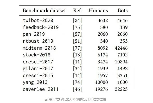 這些論文中的大多數基準數據集都是在不同推文中收集的數據集合,其中許多都是在特定推文(例如包含特定主題標簽的推文)中收集的,每條都由人類(lèi)手動(dòng)標記為機器人或人類(lèi)。然而這種經(jīng)過(guò)專(zhuān)門(mén)訓練的機器人檢測模型在該專(zhuān)業(yè)領(lǐng)域表現出色,卻并沒(méi)有涵蓋全部領(lǐng)域,并且嚴重依賴(lài)于特定數據,而不是機器人和人類(lèi)之間的根本差異。