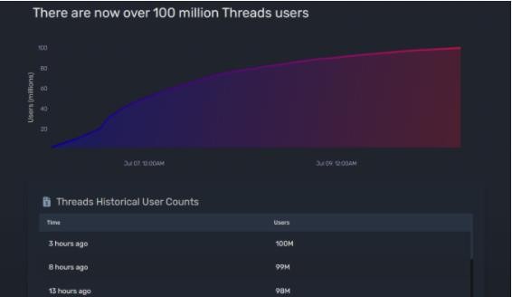 北京時(shí)間周一午后 15 點(diǎn)左右,據數據追蹤網(wǎng)站 Quiver Quantitative 披露,Threads 的登錄用戶(hù)數已經(jīng)突破 1 億人。此時(shí)距這款軟件 7 月 5 日在美洲地區首發(fā)上線(xiàn)連 5 天整都沒(méi)到。