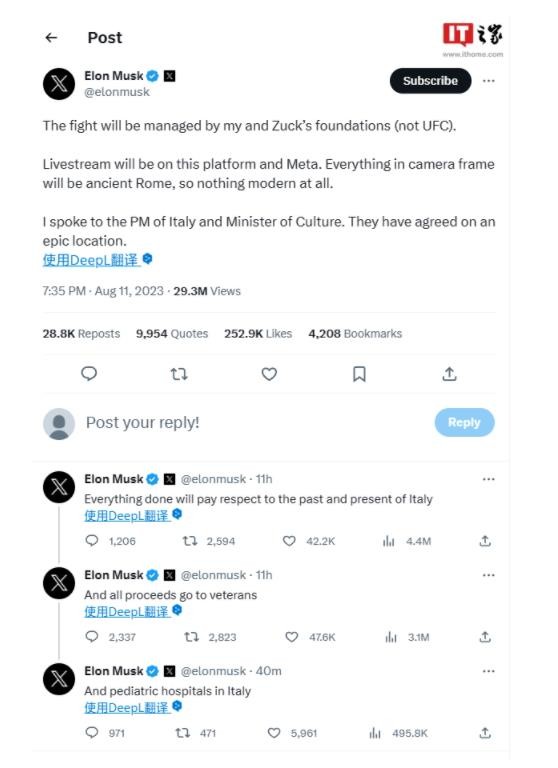 IT之家昨天曾報道馬斯克計劃將“馬扎籠斗”改成辯論賽的消息,可沒(méi)過(guò)多久,這位億萬(wàn)富翁又聲稱(chēng)這場(chǎng)戰斗仍將舉行,地點(diǎn)位于意大利的“一個(gè)史詩(shī)般的地方”。