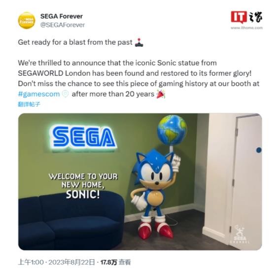 丟失 20 年的標志性索尼克雕像被世嘉找回,將在科隆游戲展亮相 09:44:18