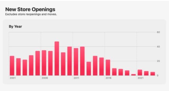 圖表顯示蘋(píng)果公司在 2012 年開(kāi)設了 40 家新店,而在 2016 年縮短到 20 家,2017 年后這個(gè)數字進(jìn)一步減少。