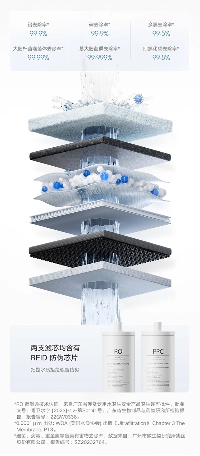 它采用了 100G 大通量 RO 反滲透技術(shù),支持 0.0001μm 高精度過(guò)濾,搭配 PPC 復合濾芯可實(shí)現雙芯 6 級精濾,高效濾除細菌、病毒、重金屬等各類(lèi)有害物,并吸附異色、余氯、異味,改善口感。