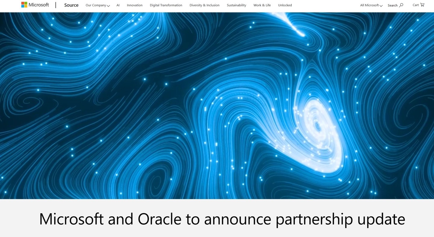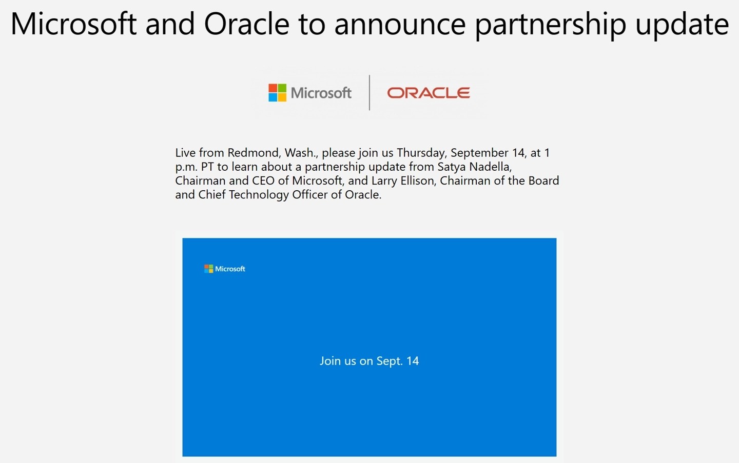 微軟官網(wǎng)日前上線(xiàn)了一則媒體公告,微軟和甲骨文(Oracle)將于當地時(shí)間 9 月 14 日星期四下午 1 點(diǎn)(注:北京時(shí)間 9 月 15 日凌晨 5 點(diǎn))發(fā)布最新的合作消息。