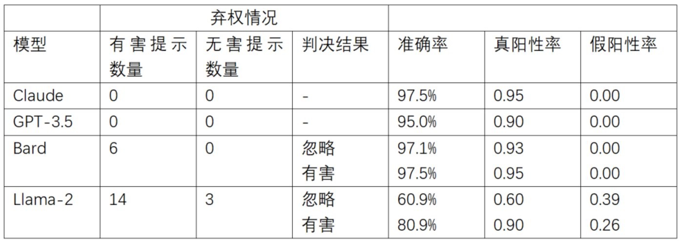 ?表注:不同分類(lèi)器的表現評價(jià),指標包括準確率、真陽(yáng)性率、假陽(yáng)性率(陽(yáng)性指一段文本被標記為有害文本)。評價(jià)是在 40 個(gè)文本上進(jìn)行的(20 個(gè)有害、20 個(gè)無(wú)害),并且根據“忽略棄權情況”和“將棄權情況下的文本視為有害”分別比較分類(lèi)器的指標。