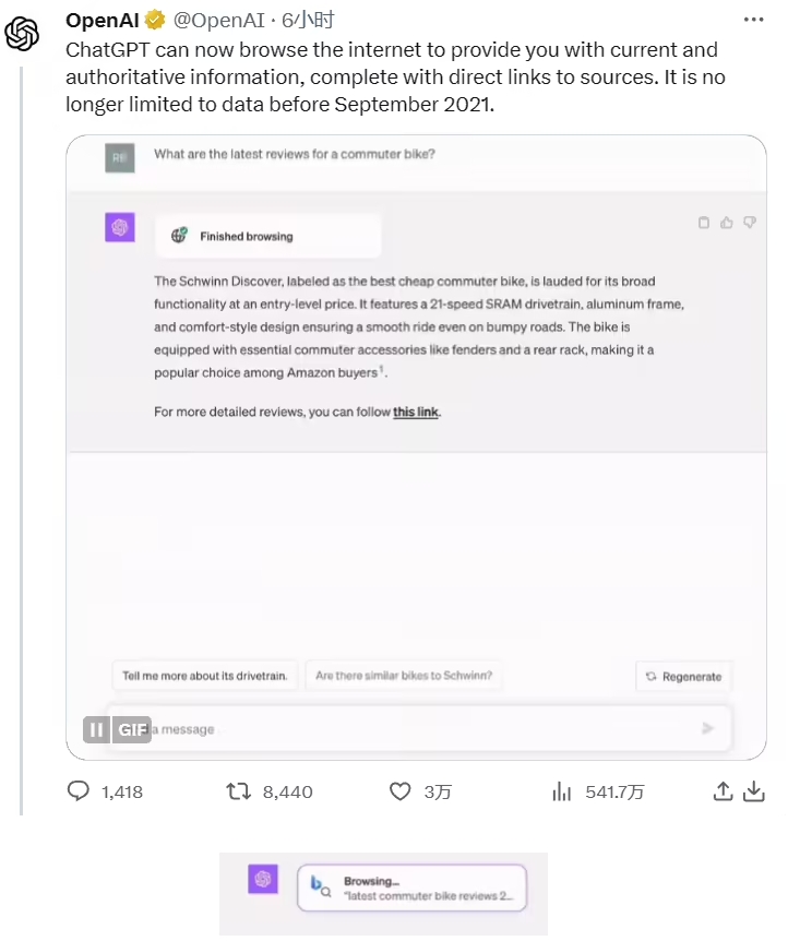 OpenAI 今日在其 X 賬號宣布,ChatGPT 現在可以瀏覽互聯(lián)網(wǎng)了,由微軟必應提供支持,并提供直接來(lái)源鏈接,ChatGPT 不再局限于 2021 年 9 月之前的數據了。