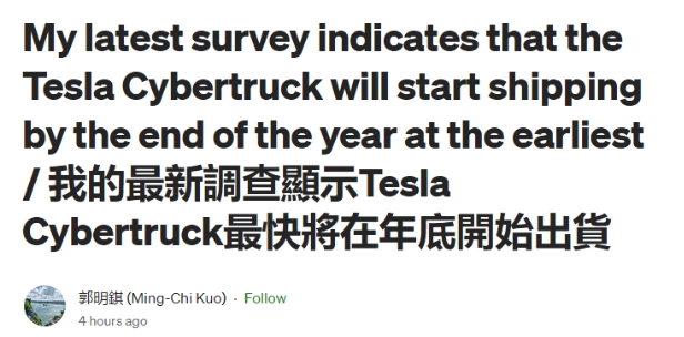 郭明錤認為 Cybertruck 對特斯拉未來(lái)數年內營(yíng)收與利潤成長(cháng)的顯著(zhù)貢獻是顯而易見(jiàn)的,且此貢獻在可見(jiàn)未來(lái)不受季節性與景氣衰退影響。