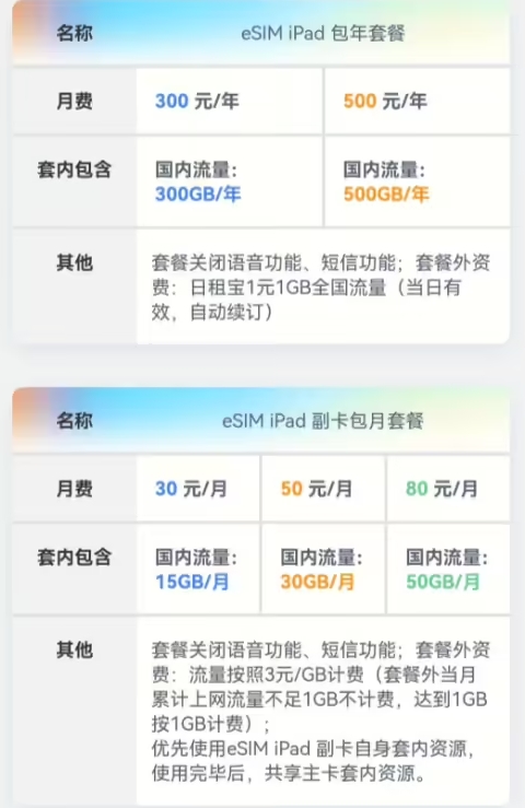 據介紹,eSIM iPad 包年套餐提供 300 元 / 年和 500 元 / 年兩個(gè)價(jià)位,分別提供 300GB / 年和 500GB / 年的國內流量。該套餐關(guān)閉了語(yǔ)音功能、短信功能,套餐外資費為日租寶 1 元 1GB 全國流量(當日有效,自動(dòng)續訂)。