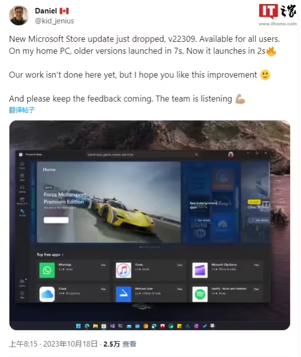 微軟應用商店 Windows 團隊的一名工程師在 X 平臺上用 Daniel 這個(gè)名字分享了這個(gè)信息,他稱(chēng)微軟應用商店的 22309 版本更新讓該應用的啟動(dòng)速度從 7 秒縮短到了 2 秒。他還用一個(gè)視頻來(lái)證明了這一點(diǎn),說(shuō)這是他在家里的電腦上拍的。
