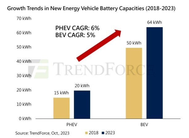 集邦咨詢(xún)在最新報告稱(chēng),插電混動(dòng)汽車(chē)在 2015 年的市場(chǎng)占有率為 9%,預估 2023 年將增長(cháng)到 21%,平均電池組容量由 2018 年的 15 千瓦時(shí)增至 2023 年的 20 千瓦時(shí)。