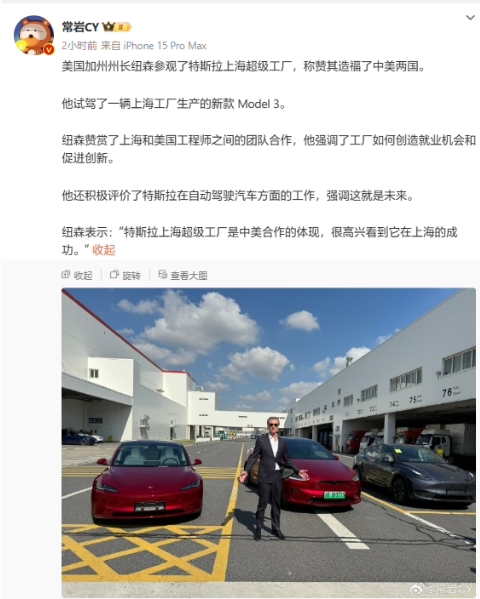 博主 @常巖 CY 今日早些時(shí)候也披露了更多關(guān)于加州州長(cháng)訪(fǎng)問(wèn)特斯拉上海超級工廠(chǎng)的細節。據介紹,加文?紐森試駕了一輛上海工廠(chǎng)生產(chǎn)的 Model 3 煥新版車(chē)型,贊賞了上海和美國工程師之間的團隊合作,并稱(chēng)贊該工廠(chǎng)是中美合作的體現。