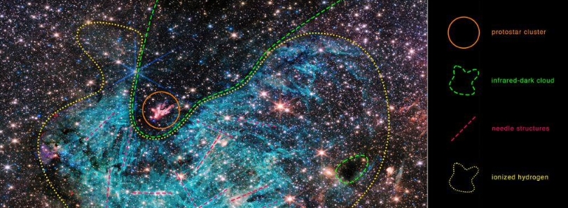 一大片電離氫,以青色顯示,包裹著(zhù)紅外暗云,該云非常密集,以至于阻擋了來(lái)自其后面遙遠恒星的光線(xiàn)。電離氫發(fā)射中有趣的針狀結構缺乏任何均勻的方向。研究人員注意到電離區域的范圍令人驚訝,覆蓋了大約 25 光年。
