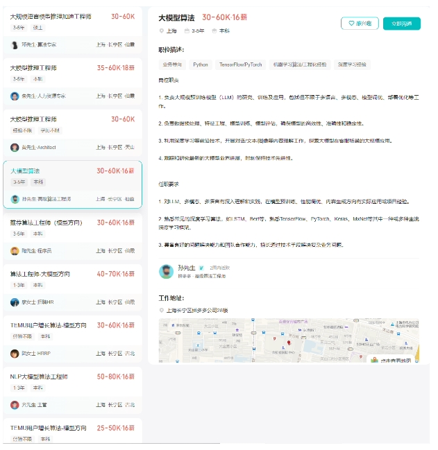 拼多多官方的招聘職位目錄中已經(jīng)出現了大模型(LLM)和 NLP 算法等領(lǐng)域的職位,大部分位于上海長(cháng)寧區,薪資大多在 30-60K 之間,其中不乏 50-80K 且 16 薪的存在。