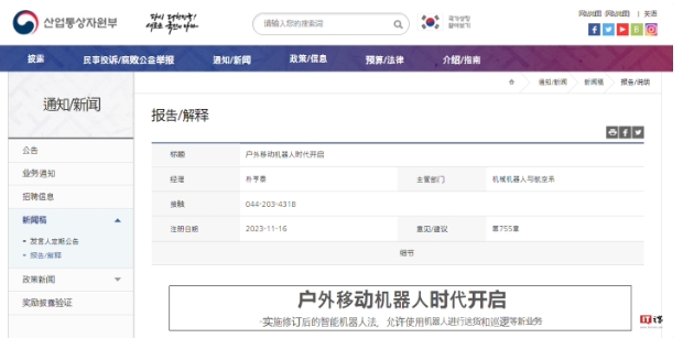 韓國產(chǎn)業(yè)通商資源部和警察廳聯(lián)合宣布,隨著(zhù)《智能機器人法》 ( 2016 年 5 月 23 日修訂、 2017 年 11 月 23 日實(shí)施)和《道路交通法》( 2018 年 4 月 23 日修訂、2019 年 10 月 23 日實(shí)施)修訂實(shí)施,戶(hù)外移動(dòng)機器人獲得駕駛安全認證,授予行人身份,允許在人行道通行。