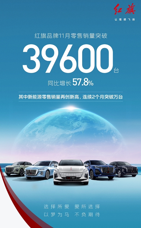 一汽紅旗今晚公布了月度銷(xiāo)量數據,紅旗品牌 11 月零售銷(xiāo)量突破 39600 臺,同比增長(cháng) 57.8%,其中新能源汽車(chē)零售銷(xiāo)量再創(chuàng )新高,實(shí)現連續 2 個(gè)月突破萬(wàn)臺。