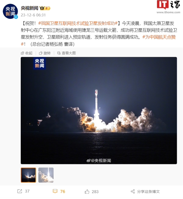 祝賀!我國衛星互聯(lián)網(wǎng)技術(shù)試驗衛星發(fā)射成功