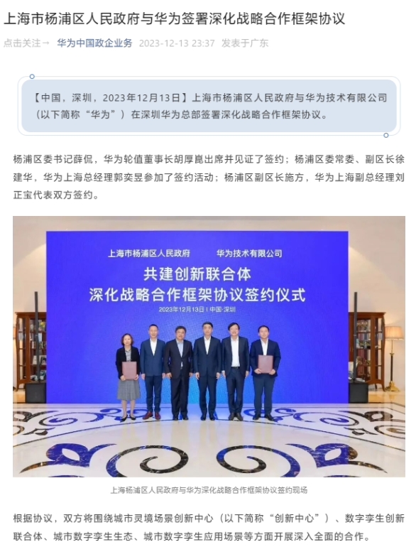 據“華為中國政企業(yè)務(wù)”官方公眾號,上海市楊浦區人民政府與華為技術(shù)有限公司 13 日在深圳華為總部簽署深化戰略合作框架協(xié)議。