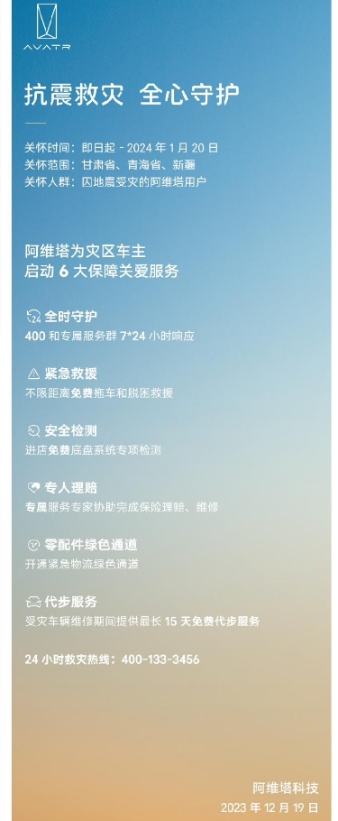 阿維塔今日宣布為甘肅、青海、新疆地震災區車(chē)主啟動(dòng) 6 大保障關(guān)愛(ài)服務(wù),并開(kāi)通 24 小時(shí)救災熱線(xiàn)。