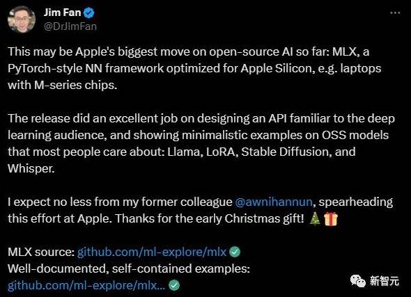 MLX 的另一大特點(diǎn),像 Jim Fan 指出的那樣,是它設計出色的 API。
