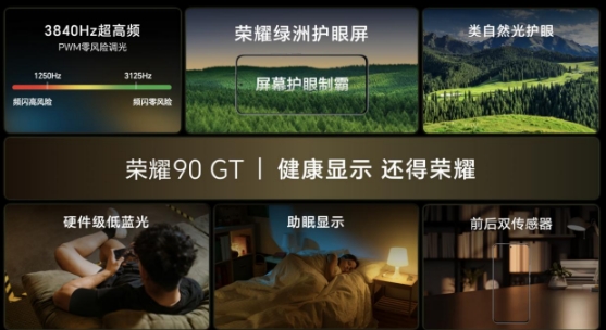 為確保用戶(hù)用眼健康,榮耀90 GT配備行業(yè)唯一的零風(fēng)險調光護眼屏——榮耀綠洲護眼屏,具有3840Hz超高頻PWM調光、類(lèi)自然光護眼技術(shù)、助眠顯示功能、360°自適應調光與暗光舒適性調節等領(lǐng)先技術(shù),有效緩解長(cháng)時(shí)間游戲導致的眼部疲勞,為玩家帶來(lái)全方位健康保障。