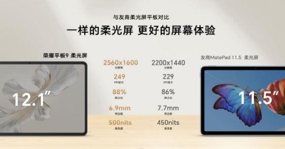 除了柔光屏技術(shù)外,榮耀平板9的這塊12.1英寸大屏,還擁有高達88%的屏占比,具備旗艦級平板的屏占比水準;支持2.5K分辨率,120Hz刷新率和10.7億色高色深顯示,為用戶(hù)提供順滑流暢的視覺(jué)效果和鮮活的色彩呈現;屏幕亮度高達500nits,在強光下屏幕內容依然清晰可見(jiàn)。即使與友商柔光屏平板對比,榮耀平板9在分辨率,PPI顯示,屏占比等五個(gè)重要維度上都大幅領(lǐng)先。