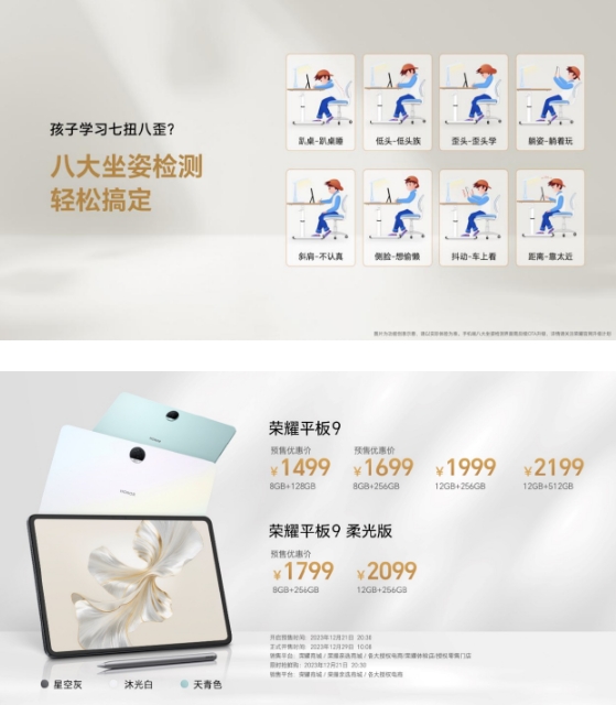 榮耀平板9共推出8GB+128GB、8GB+256GB、12GB+256GB、12GB+512GB四個(gè)版本,預售優(yōu)惠價(jià)1499元起。榮耀平板9柔光版推出8GB+256GB、12GB+256GB兩個(gè)版本,預售優(yōu)惠價(jià)1799元起。2023年12月21日20 : 30開(kāi)啟預售,2023年12月29日10 : 08正式開(kāi)售。用戶(hù)屆時(shí)可前往榮耀商城/榮耀親選商城/各大授權電商/榮耀體驗店/授權零售門(mén)店進(jìn)行選購。