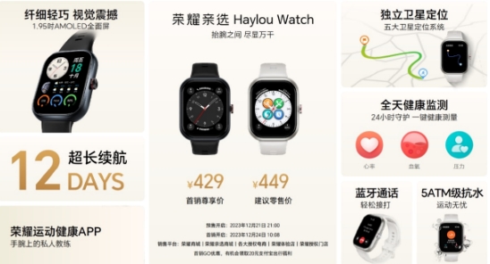 本次榮耀新品發(fā)布會(huì )還帶來(lái)了榮耀親選Haylou Watch智能手表,它采用1.95英寸輕薄全面屏,集成獨立衛星定位、120種運動(dòng)模式及心率、血氧、睡眠監測健康功能,支持12天超長(cháng)續航。12月24日新品首銷(xiāo),售價(jià)449元。消費者可通過(guò)榮耀商城、榮耀親選商城、榮耀京東自營(yíng)旗艦店、榮耀天貓官方旗艦店、榮耀體驗店、榮耀各大授權門(mén)店等多渠道進(jìn)行購買(mǎi)。